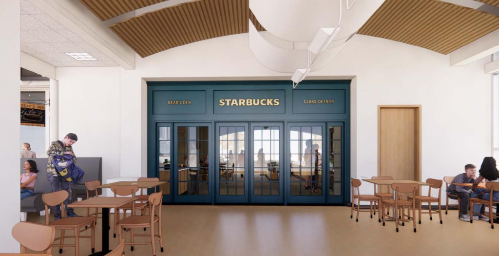 Starting the second week of July, construction will shift to installing the Starbucks signature interior features. This space will remain named in honor of the Class of 1944, but will be infused with a fully-licensed Starbucks with its full menu of food and beverages.