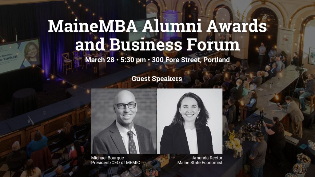 When: March 28 at 4:30 (networking), 5:30 (program begins) Where: 300 Fore Street, Portland Click Here to Register! Join us to discuss and learn about business in Maine, industry trends, … Continue reading 3/28 MaineMBA Alumni Awards and Business Forum