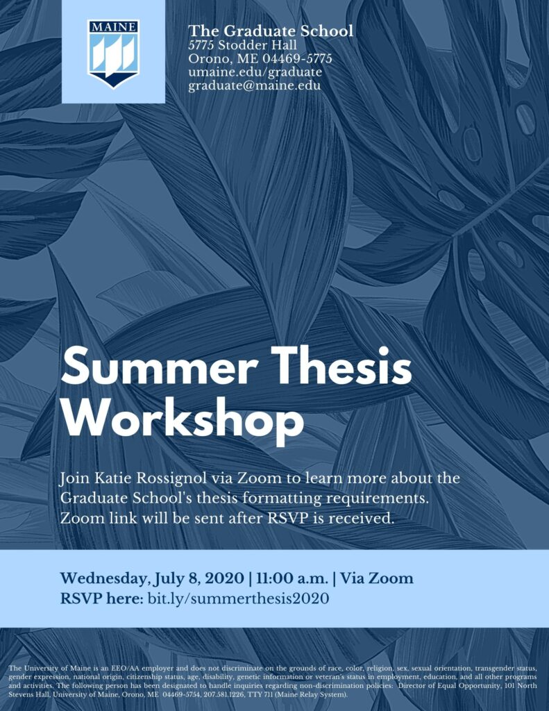 Join Katie Rossignol via Zoom to learn more about the Graduate School's thesis formatting requirements. Zoom link will be sent after RSVP is received.