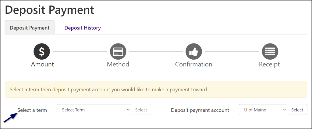 6. Navigate to “Select a Term” and select your desired term from the dropdown menu. You will then be able to make your Housing Deposit payment.
