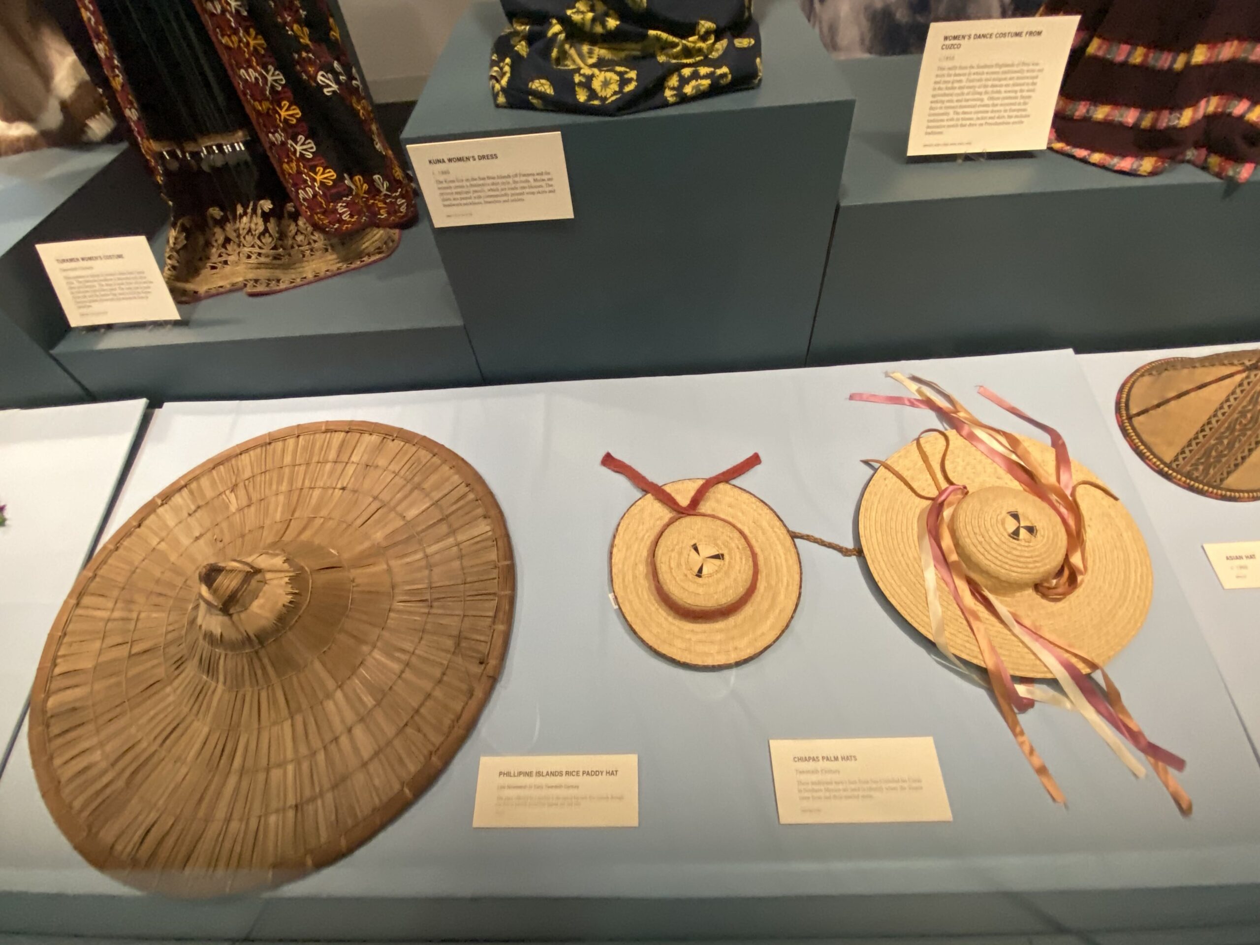 The larger hat on the left is a rice paddy hat from the Philippine Islands. It’s large shape would provide excellent protection from the heavy rains in that region. The two smaller hats on the right are from the Mexican state of Chiapas, which gets much less rain, but is very sunny. These hats would do an excellent job of shading the eyes.