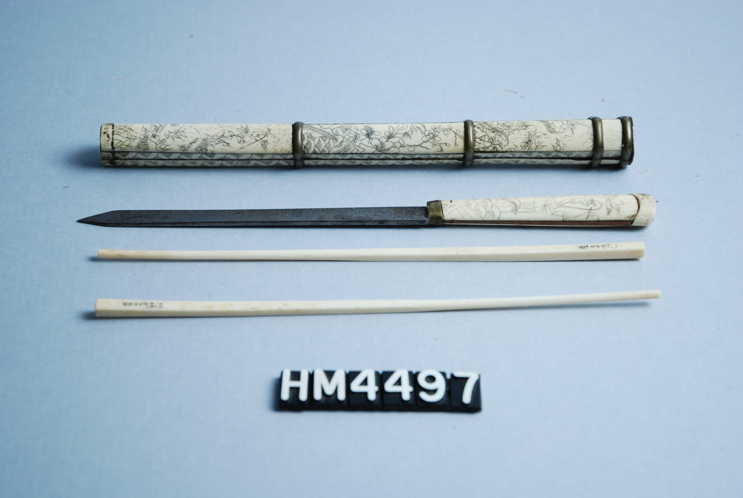 This set consists of a knife and chopsticks designed for use while traveling.