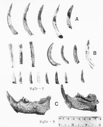 These archaeological specimens show evidence of having been used in the same fashion as crooked knives, chisels or small gouges. Sections A and B show modified beaver teeth from the Carson Site, Passamaquoddy Bay, New Brunswick, 1000 BP. Section C shows beaver mandibles from the Sand Point Site, St. Croix River.