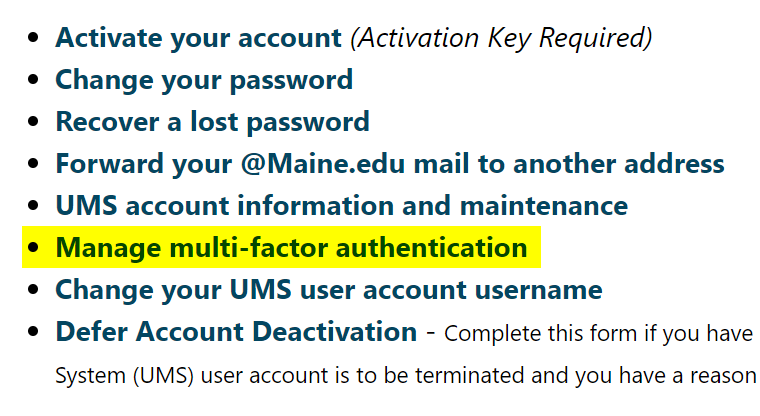 Navigate to accounts.maine.edu and select “Manage multi-factor authentication”. If you get a message saying you are ineligible, please contact IT Support and ask to be made eligible for MFA.