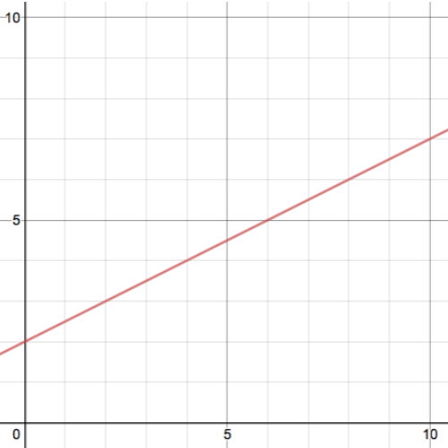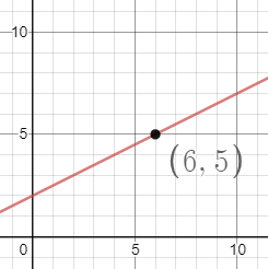 | Part a. | Does the point (6, 5) fall on the graph of the line ?Click here to show solution.A coordinate point tells you the x-coordinate first, followed by the y-coordinate. We can see that the point (6, 5) has an x-coordinate of 6. We can see on the x-axis, between 0 and 5, that this region is divided into 5 equal parts, marked by the light grey lines. This means that each square cell on the grid is one unit wide. To find 6 on the x-axis, we just need to go one unit to the right of the 5. Then, we follow the light grey vertical grid-line up to the red line, and we have found the point on the line with x-coordinate 6. Finally, we follow the light grey horizontal grid-line from this point to the left, until we reach the y-axis. This horizontal grid-line intersects the y-axis right at the number 5, so we know that 5 is the y-coordinate that corresponds to the x-coordinate of 6. ![]() Thus, we have determined that (6, 5) does in fact fall on the graph of the line. |