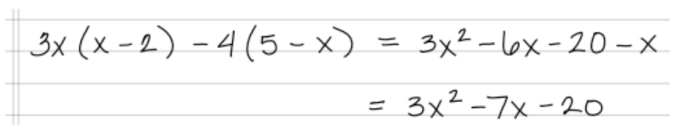 Notice how the first term is positive, because it is the product of two negatives. This is also true of the third term, 1x. Also, instead of writing 1x, we usually just write x, and the coefficient of 1 is implied Now we can combine -5x and x to make -4x: