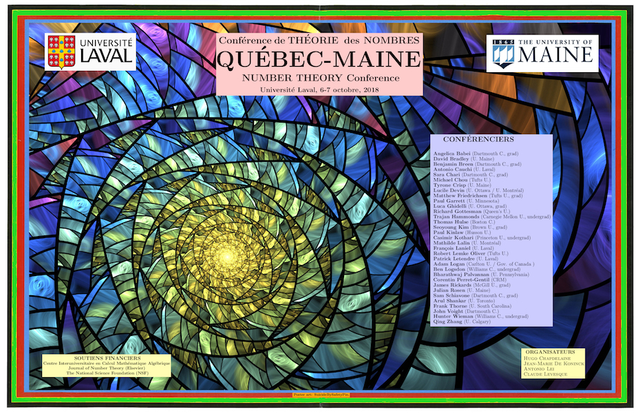 The 2018 Québec/Maine Number Theory Conference was held on the weekend of October 6-7 at the Université Laval in Québec.  Organized jointly by faculty at UMaine and ULaval, it featured lectures by an international group of mathematicians who do research in number theory.  More information may be found on the conference website.