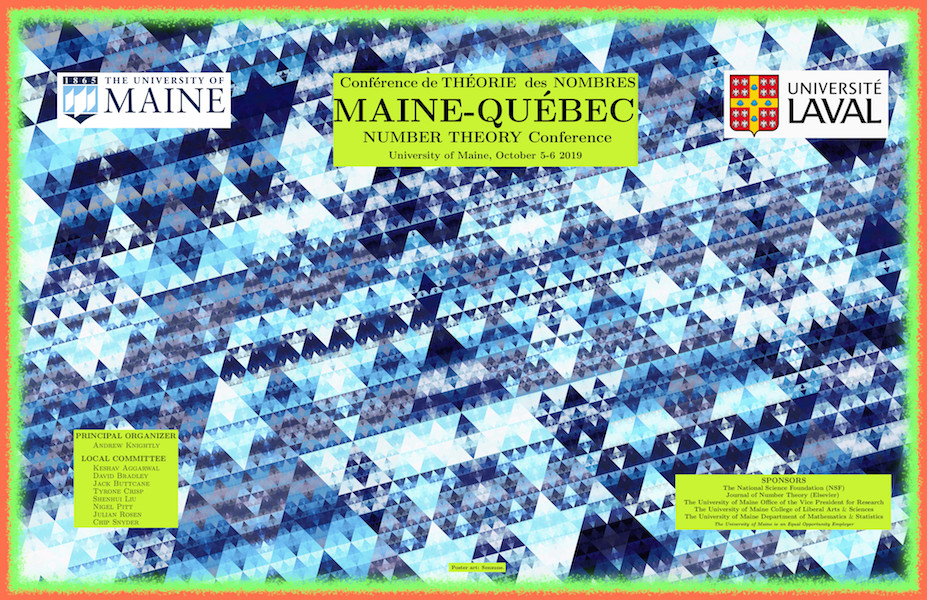 The 2019 Maine/Québec Number Theory Conference will take place on October 5-6 at the University of Maine. It will feature 65 lectures by an international group of mathematicians who do research in number theory. More information may be found on the conference website.