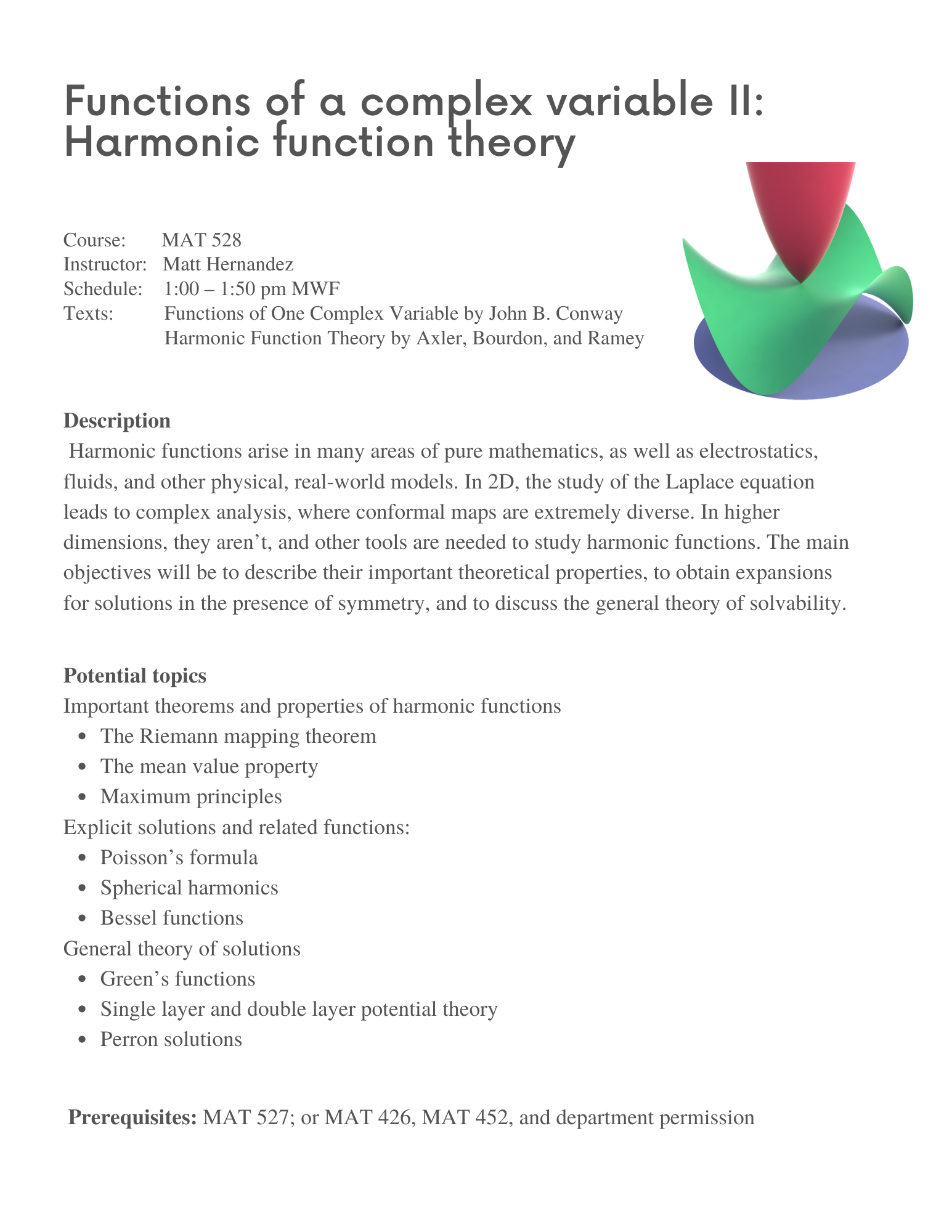 MAT 528 – Functions of a Complex Variable II, MWF 1:00 – 1:50 pm, Hernandez
