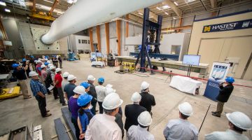 The University of Maine unveiled an innovative, rapidly deployable bridge system Thursday, July 12 at the Advanced Structures and Composites Center. Engineers, Maine Department of Transportation officials, business leaders, investors, researchers, staff and representatives from Advanced Infrastructure Technologies (UMaine’s licensee for the original “Bridge-in-a-Backpack”) attended the event, at which a composite bridge girder was strength-tested